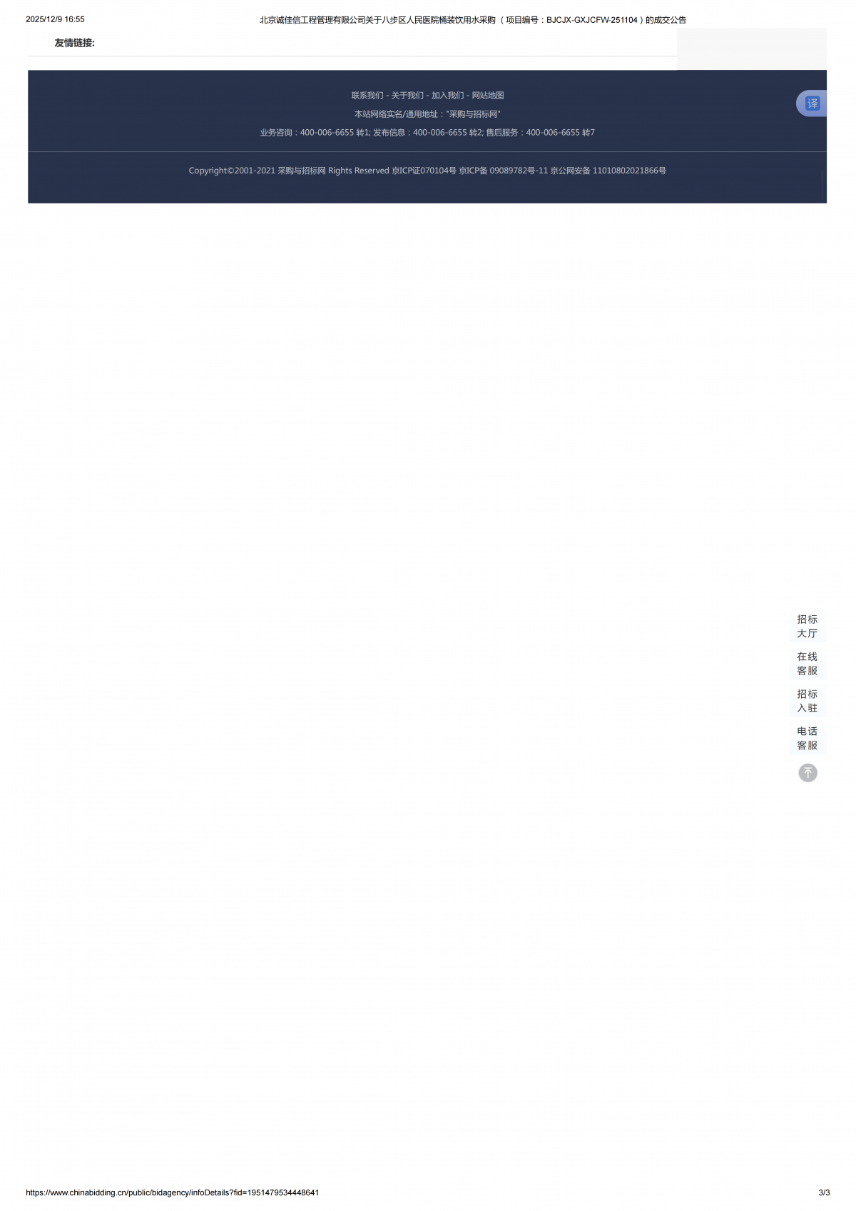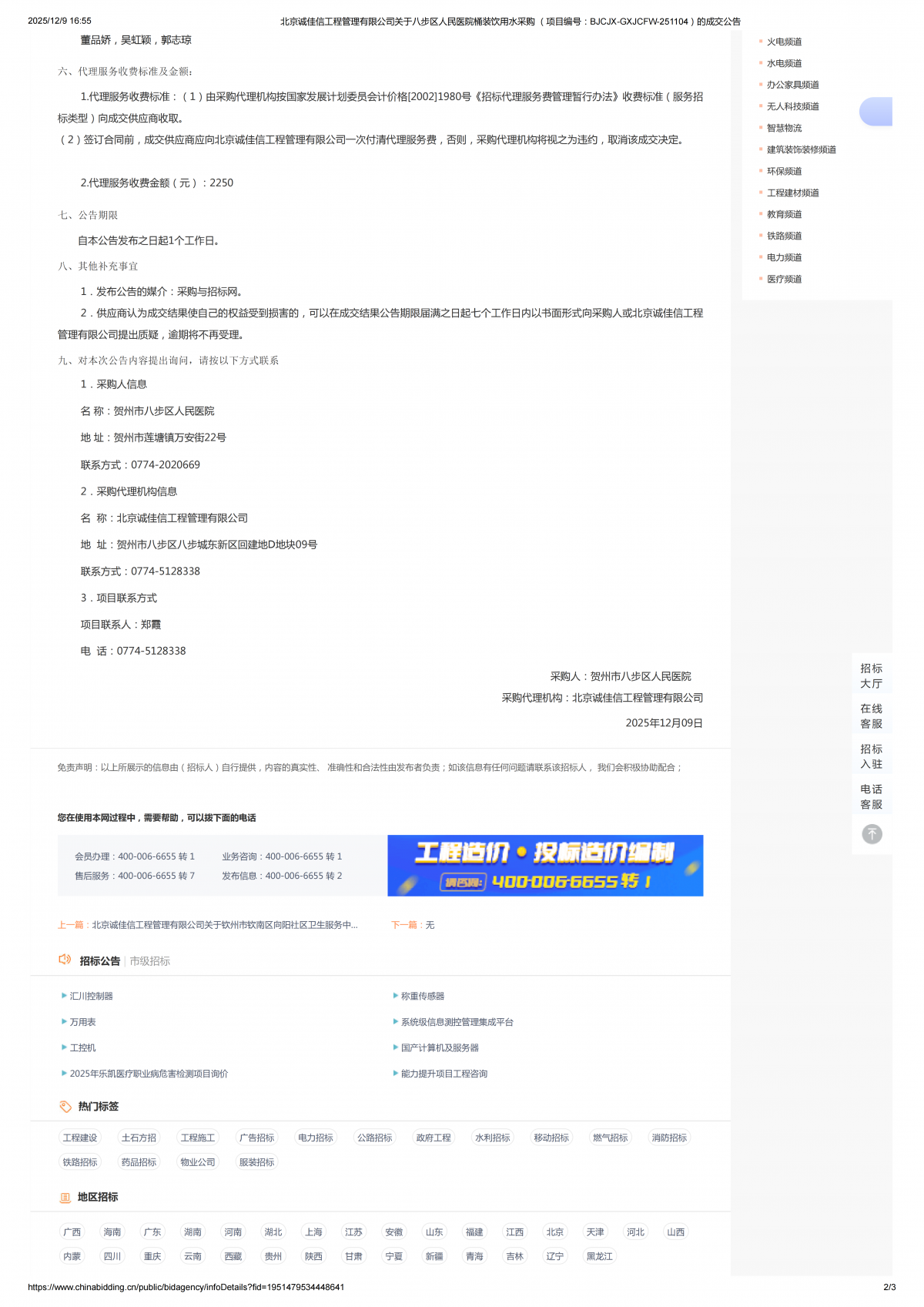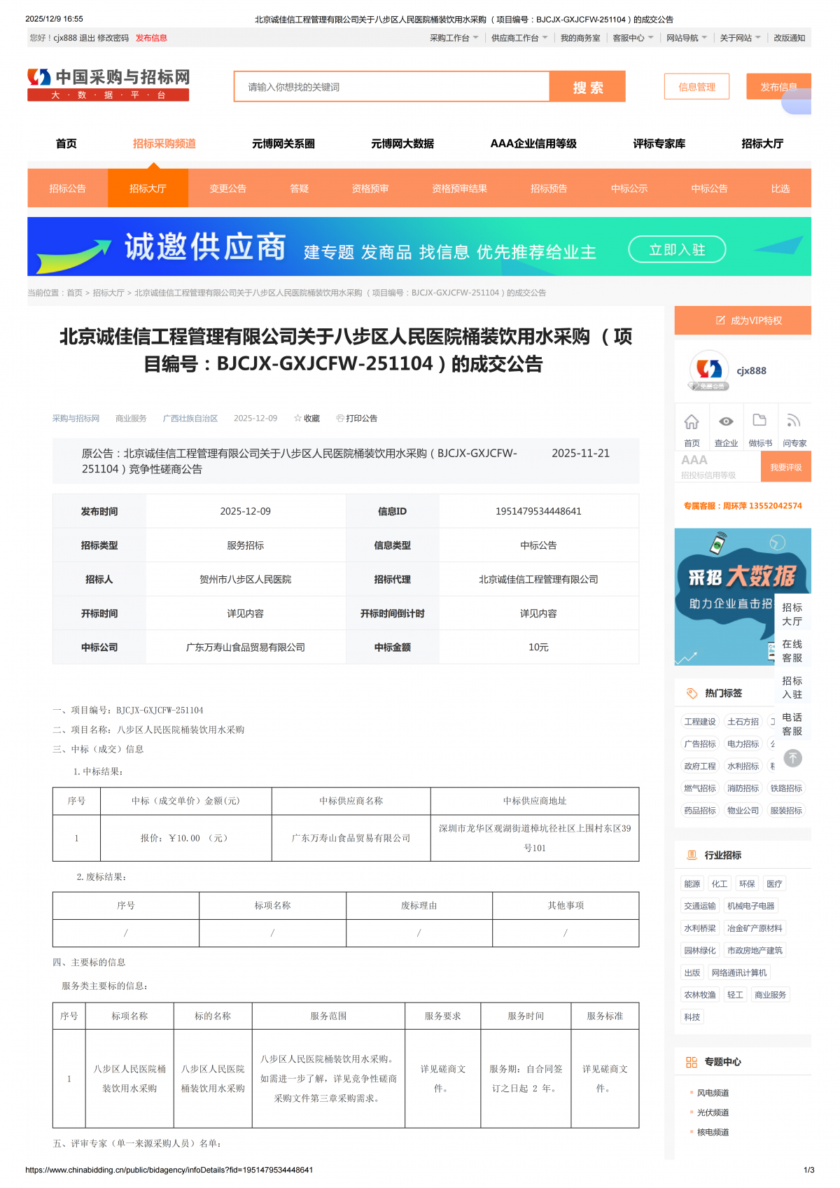 关于八步区人民医院桶装饮用水采购 (项目编号:BJCJX-GXJCFW-251104)的成交公告 2025-12-09 17:12:28贺州市八步区人民医院+桂东卫校附属医院 如拟:https://www.chinabidding.cn/public/bidagency/infoDetails?fid=1951479534448641
