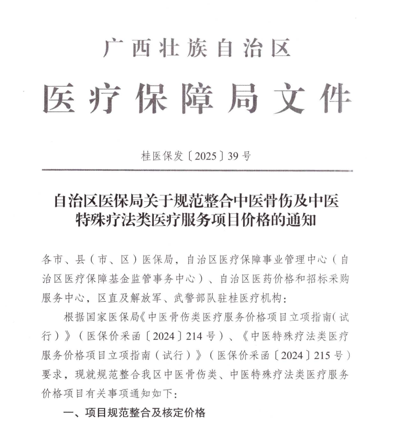 《自治区医保局关于规范整合中医骨伤及中医特殊疗法类医疗服务项目价格的通知》(桂医保发〔2025〕39号) 2025-12-23 15:53:34管理员 附件3:广西废止中医骨伤类、中医特殊疗法类等医疗服务价格项目.xls附件2:广西中医骨伤类、中医特殊疗法类医疗服务价格项目映射关.xls自治区医保局关于规范整合中医骨伤及中医特殊疗法类医疗服务项目.pdf附件1:广西规范整合中医骨伤及中医特殊疗法类医疗服务价格项目.xls