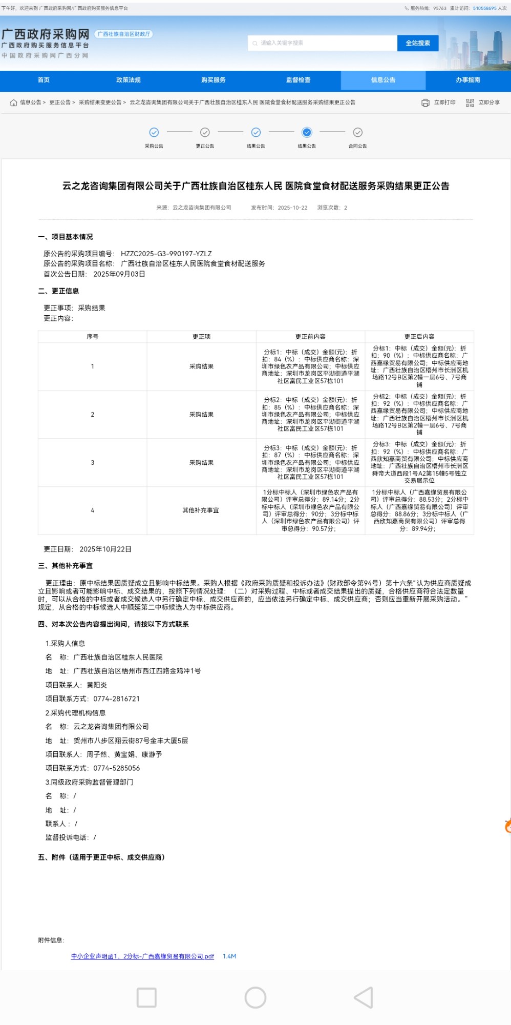 广西壮族自治区桂东人民医院食堂食材配送服务采购结果更正公告