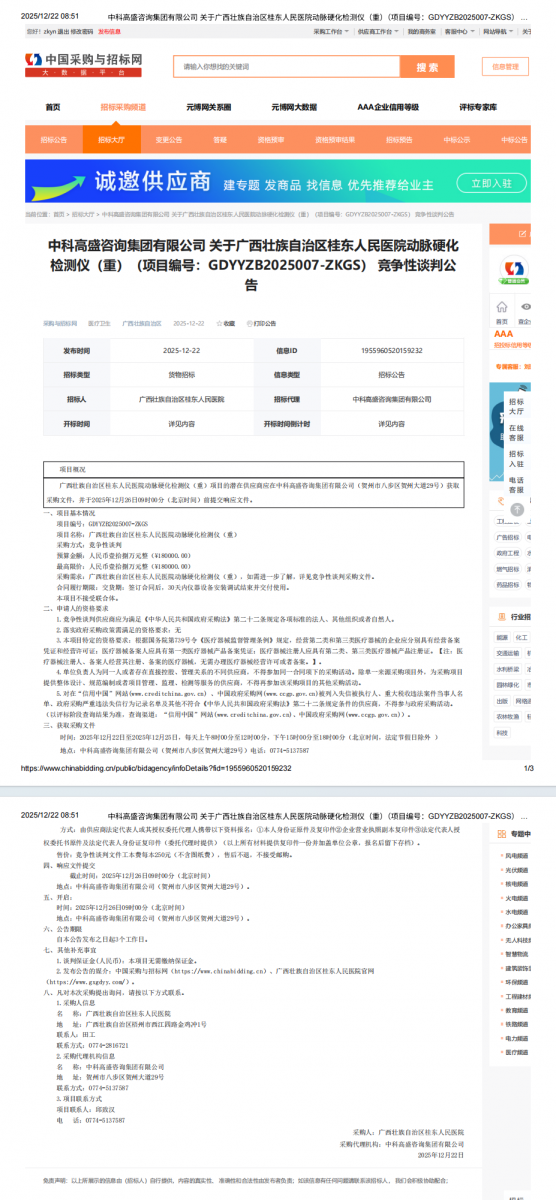 广西壮族自治区桂东人民医院动脉硬化检测仪(重)竞争性谈判公告